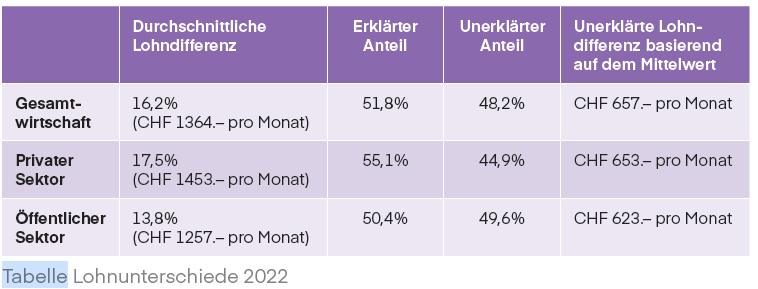 Besonders relevant ist der bereinigte beziehungsweise unerklärte Teil der Lohnlücke. In der Lohnstrukturerhebung 2022 konnte knapp die Hälfte der Lohndifferenz statistisch nicht erklärt werden, obwohl Faktoren wie Alter, Ausbildung, Branche, Beruf, Unternehmensgrösse und Hierarchiestufe berücksichtigt wurden. Das Eidgenössische Büro für die Gleichstellung zeigt in der Tabelle auf, dass von einem durchschnittlichen monatlichen Lohnunterschied von CHF 1364.– nur 51,8% erklärbar sind; der Rest von CHF 657.– gilt als unerklärter Lohnunterschied (siehe Tabelle).